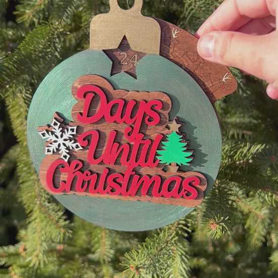 Add a festive touch to your holiday décor with this beautifully crafted large wooden Christmas countdown ornament! Designed to look like a classic ornament shape, it features layered 3D details including a bright red “Days Until Christmas” script, a white snowflake, and a green Christmas tree.