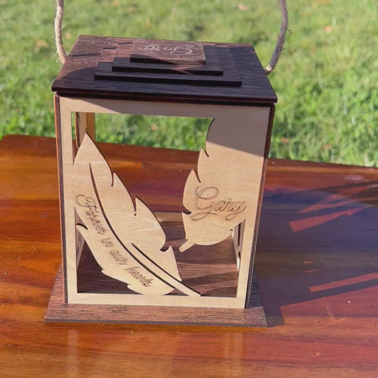 This wooden memory lantern is a heartfelt way to honor someone special—especially during the holidays, when the absence of loved ones is felt even more deeply. Crafted with a warm, natural wood finish, it features delicate feather cutouts and the engraved message “Forever in our hearts.” The opposite feather is personalized with the name “Gary,” creating a meaningful tribute that keeps their memory close.