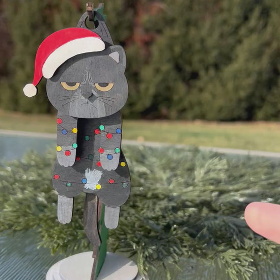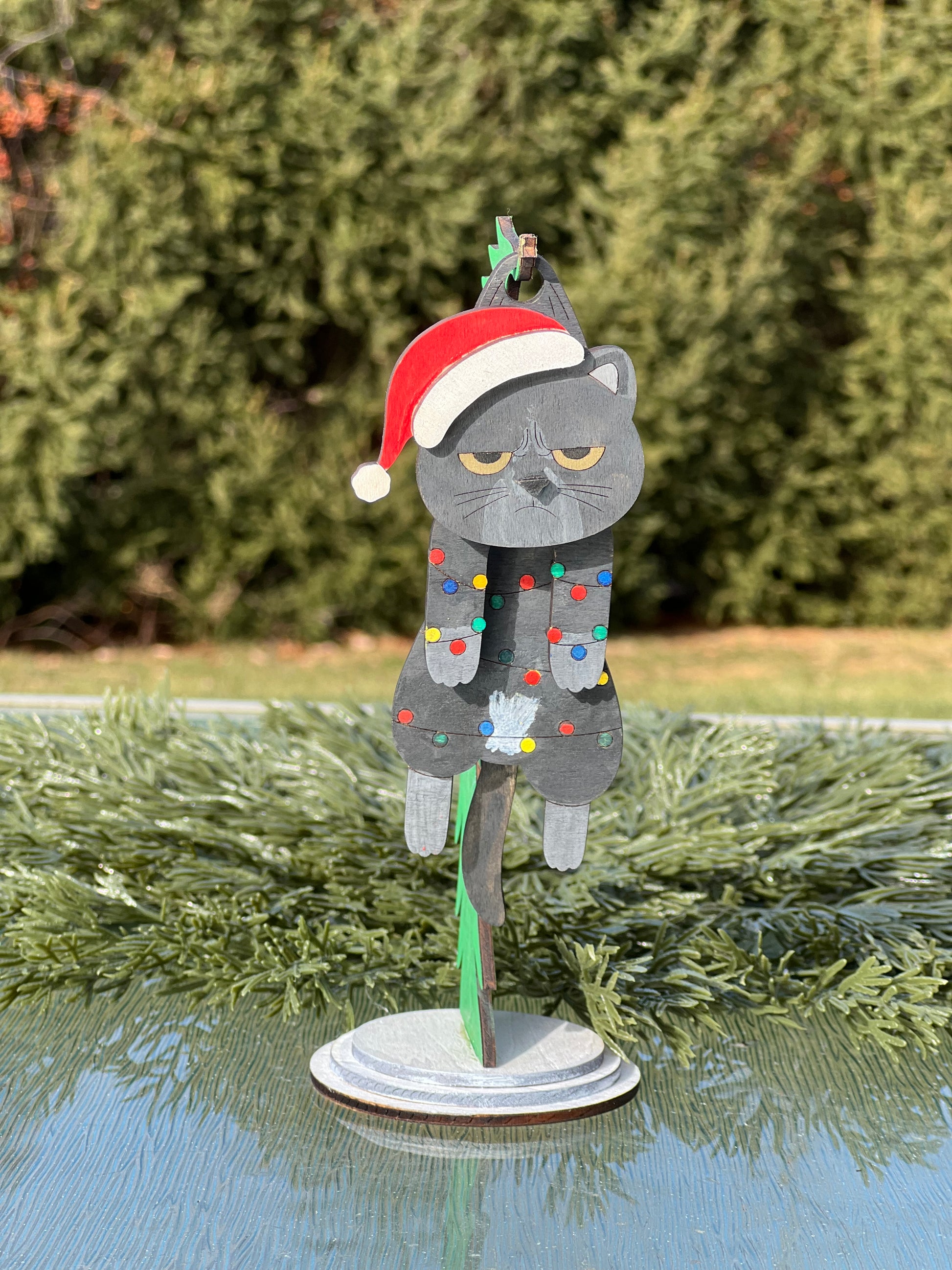 Laser-cut and hand-assembled, each ornament swings freely and features a delightfully unimpressed expression. You can choose the standard grumpy kitty or request a personalized version made to look like your cat — colors, markings, and details included. A unique, funny, and heartfelt gift for any cat lover.