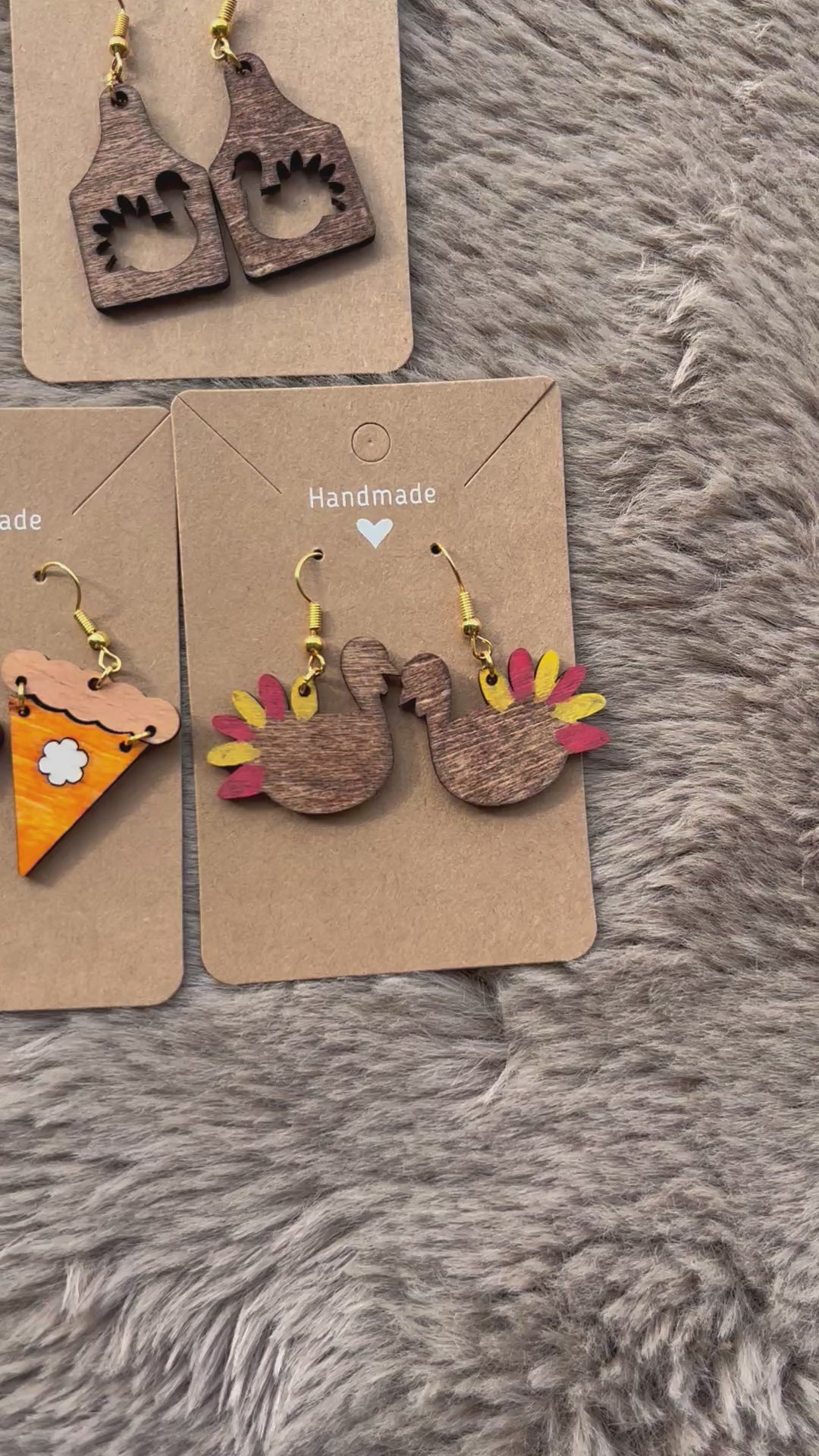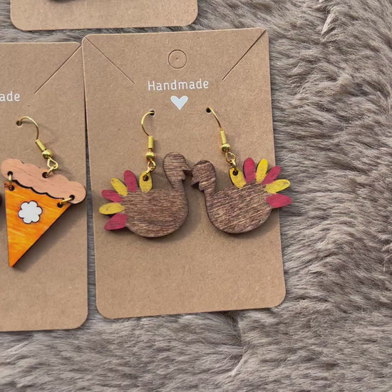 Add a festive touch to your fall outfits with these lightweight wooden earrings — perfect for Thanksgiving gatherings or everyday autumn wear! Each pair is handmade, featuring fun seasonal designs like turkeys, pie slices, pilgrim hats, and turkey handprints.