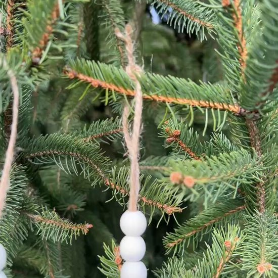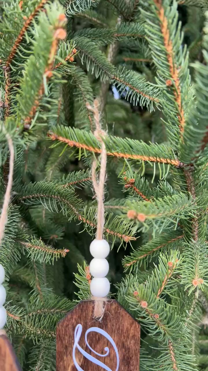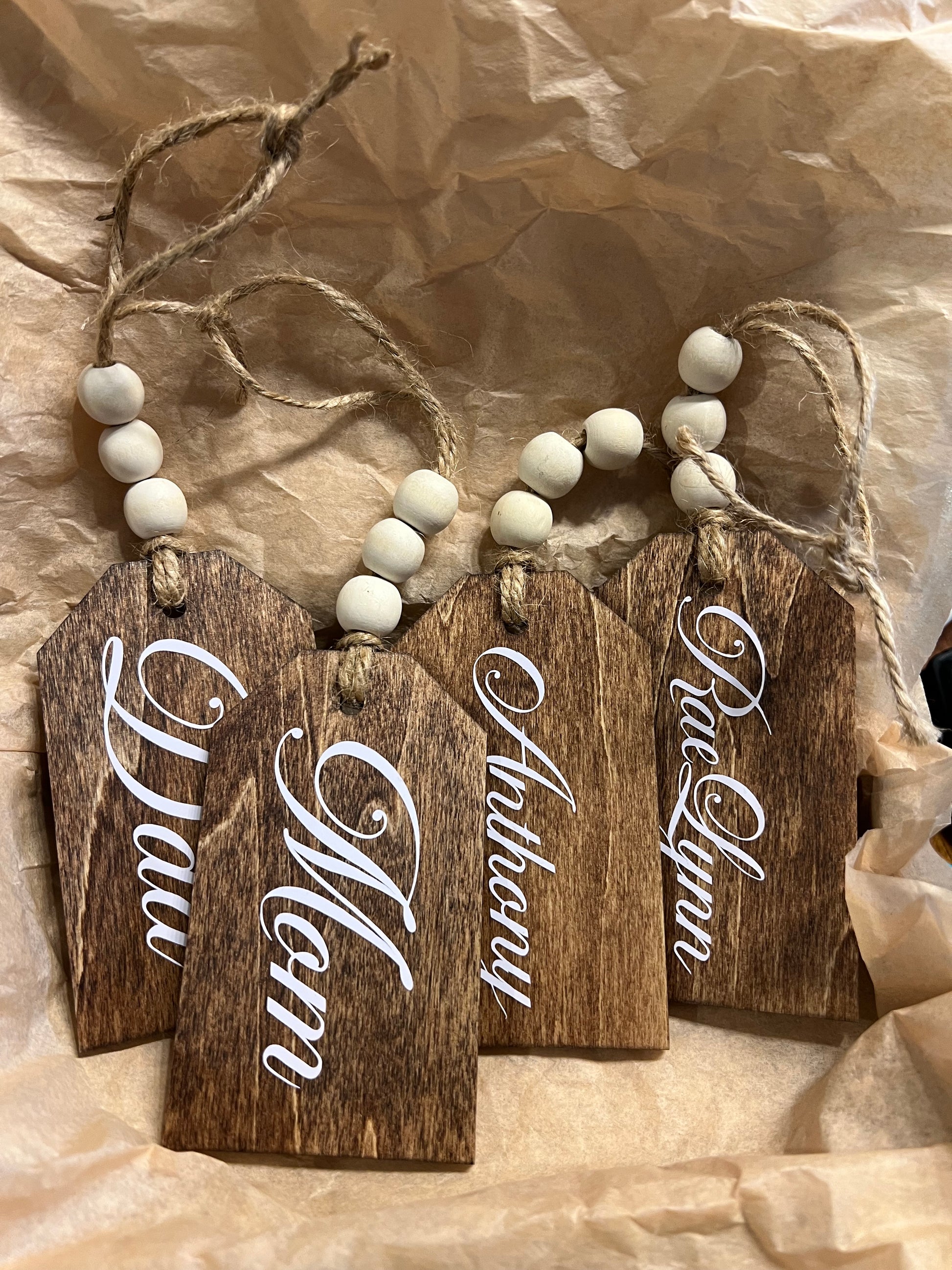 These beautifully handcrafted stocking tags add the perfect personalized touch to your holiday décor. Each tag is made from stained wood and features elegant white script lettering for a timeless, classic look. They’re finished with natural jute twine and accented with wooden beads, giving them a cozy, rustic charm that pairs perfectly with any Christmas theme.